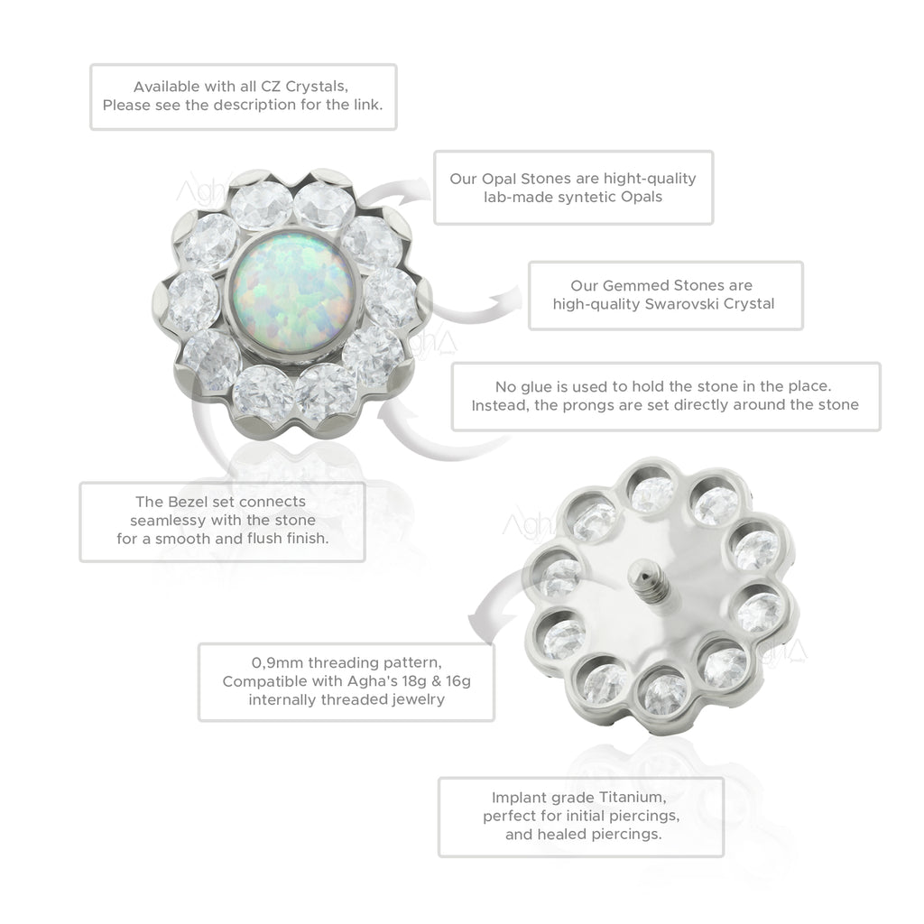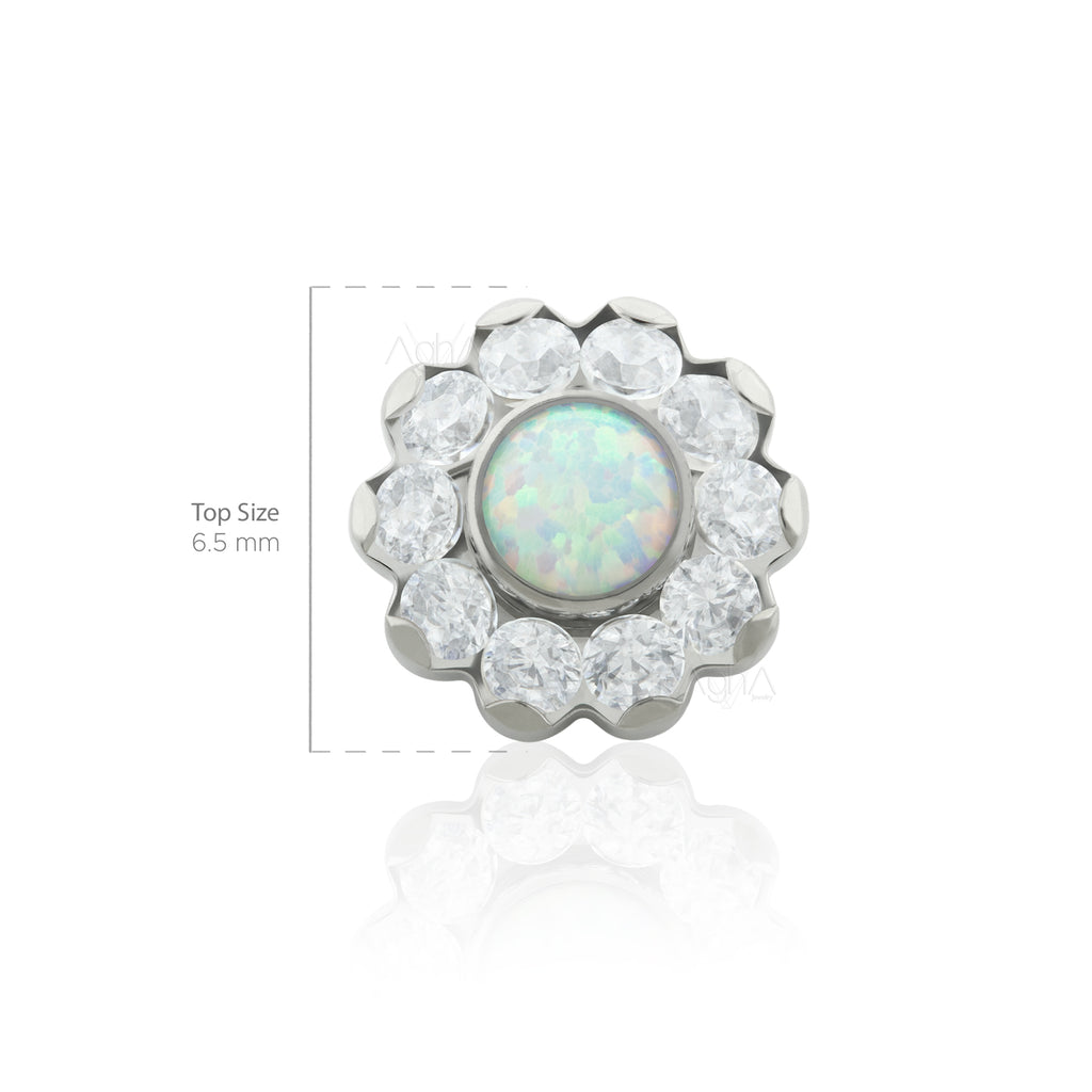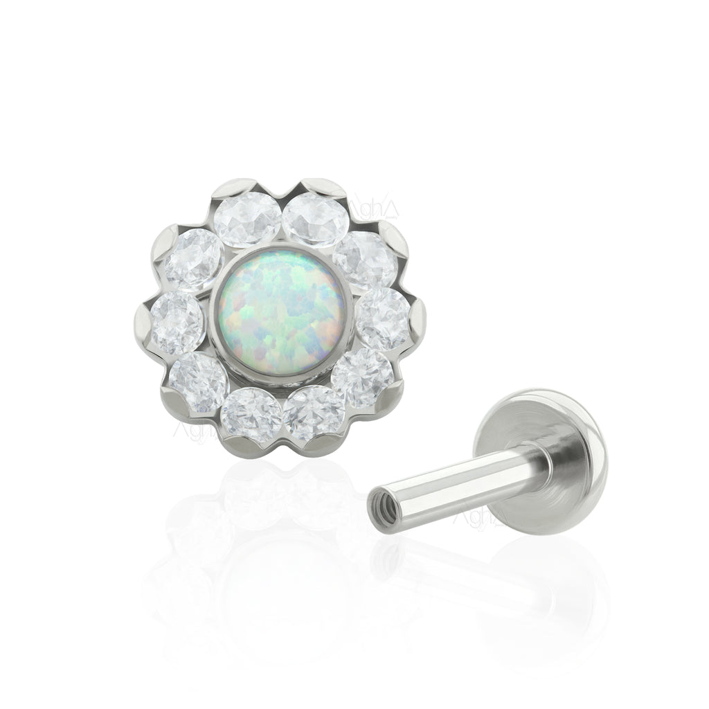 16g, Titanium ASTM F136, Internally Threaded Sunflower Labrets with Opal Centre (Top and Bottom), Prong Setting, Cubic Zirconia & Bezel Setting Opal