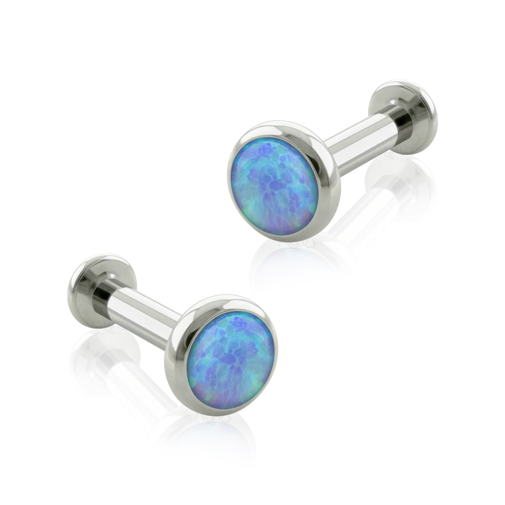 Pair 16g Titanium ASTM F136, Internally Threaded Labret, Bezel Setting, Synthetic Light Blue Opal