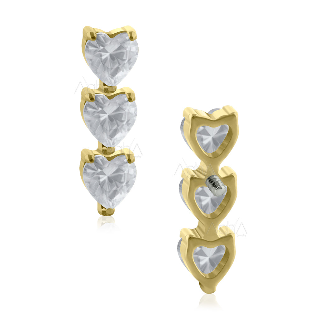 16g Plated Gold Titanium ASTM F136 Internally Threaded Big Back Labret with Cluster triple Heart (Top and Bottom), Prong Set, Cubic Zirconia Crystals