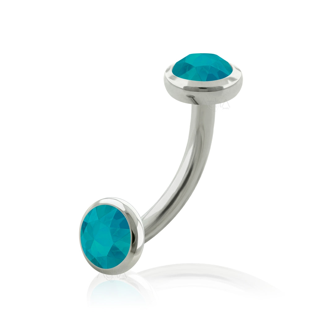 Agha 16g, Implant Grade Titanium, Internal Thread Curved Barbell with Two Crystal Tops Bezel Set, Blue Zircon Crystals