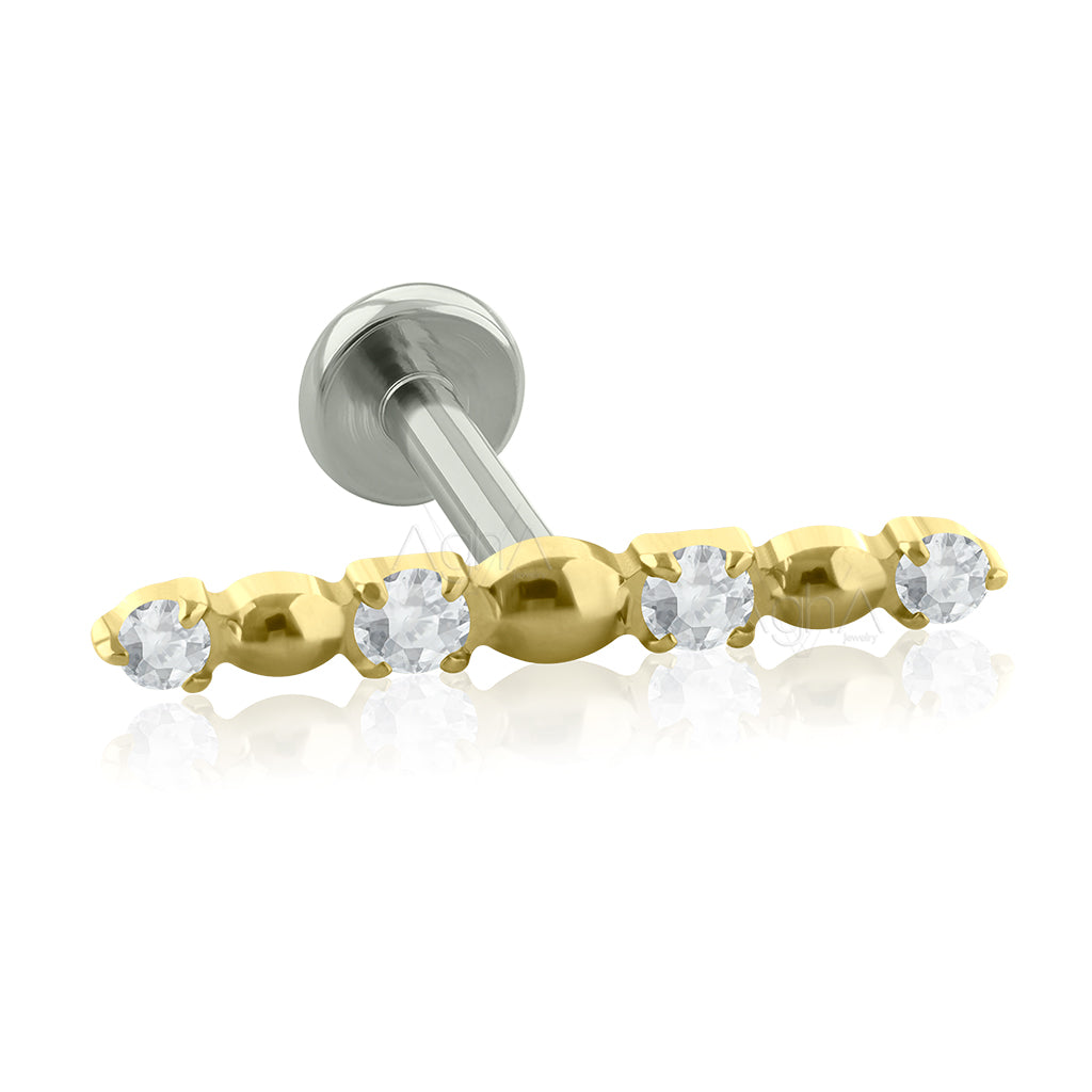 16g Plated Gold Titanium ASTM F136 Internally Threaded Big Back Labret with Cluster line Gem (Top and Bottom), Prong Set, Cubic Zirconia Crystals